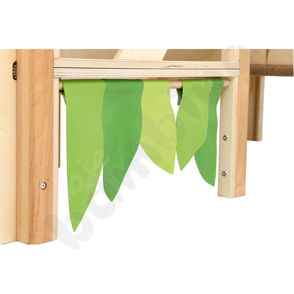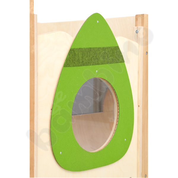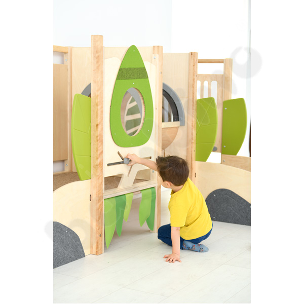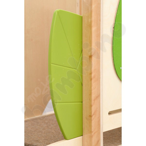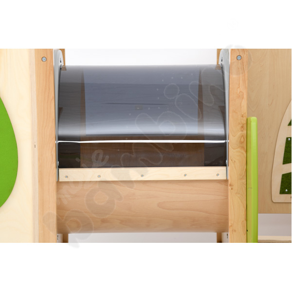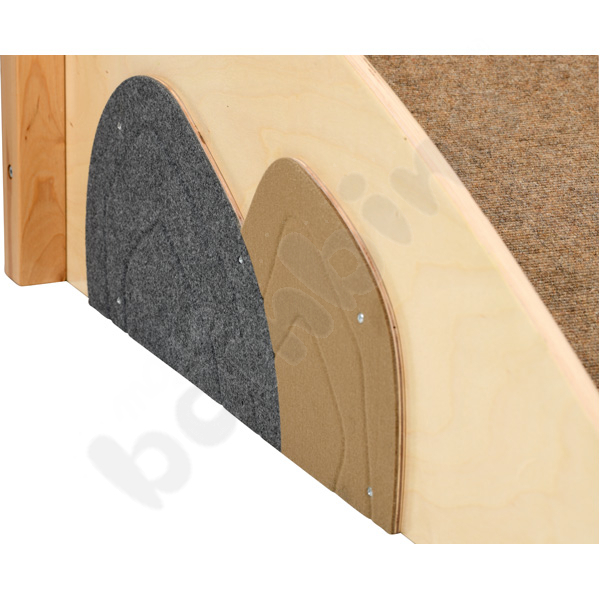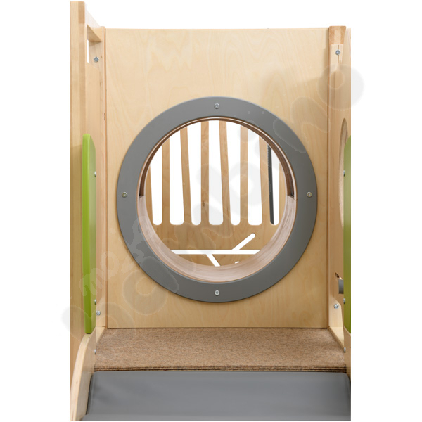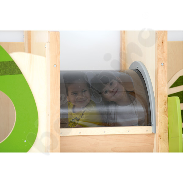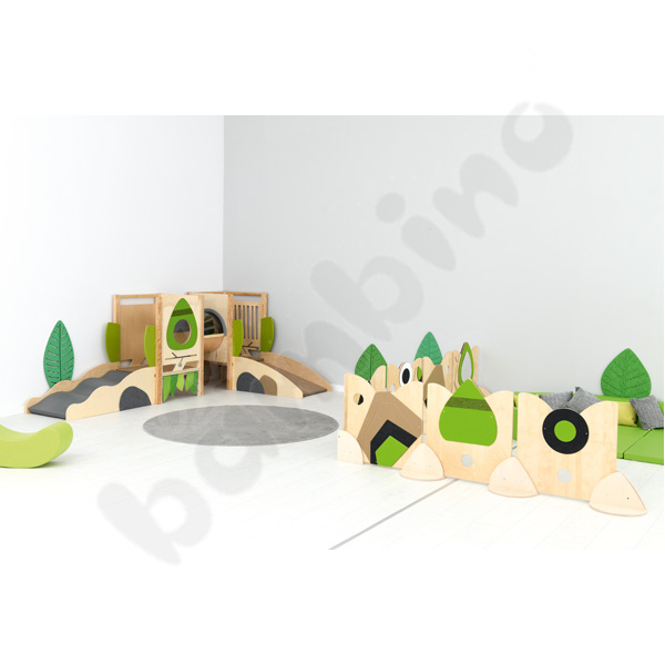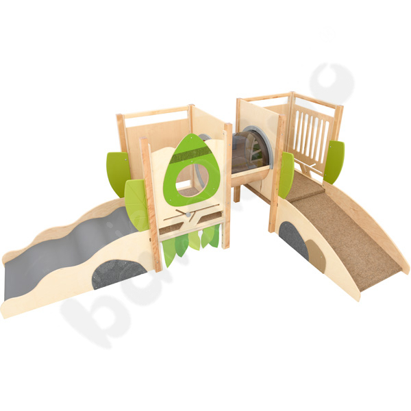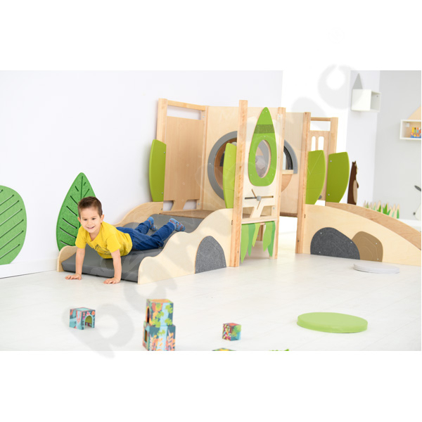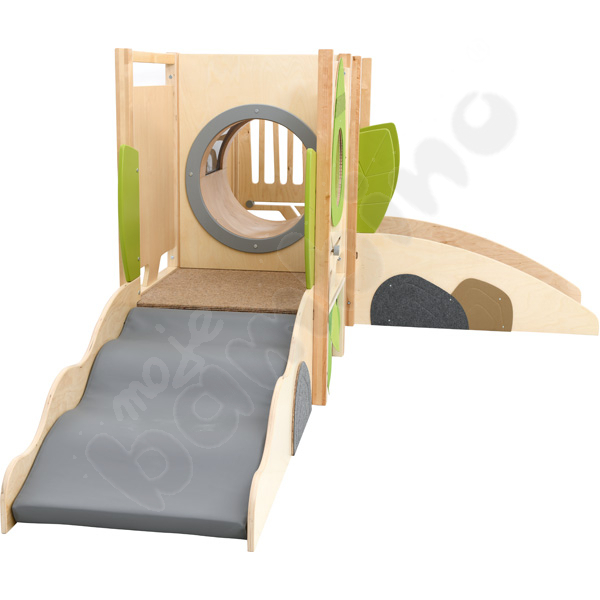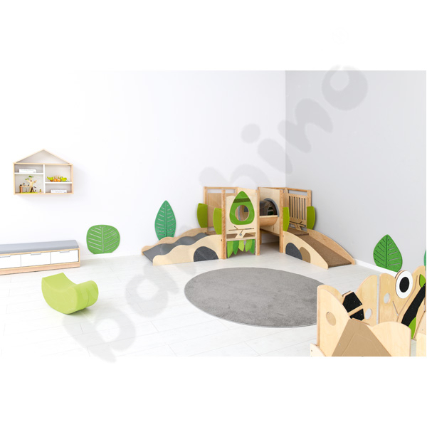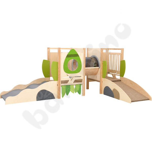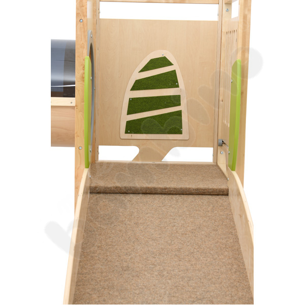 Angolo con un tunnel decorato con motivi vegetali, decorato in colori tenui che si riferiscono alla natura. In compensato laccato con gr. 18 mm e piastra laminata e legno. L’angolo è dotato anche di un materasso-onda, dopo di che i bambini possono non solo scendere, ma anche salire, scivoli, finestre e piattaforme coperte di moquette. Lo scivolo e la piattaforma inclinata possono essere installati intercambiabili.