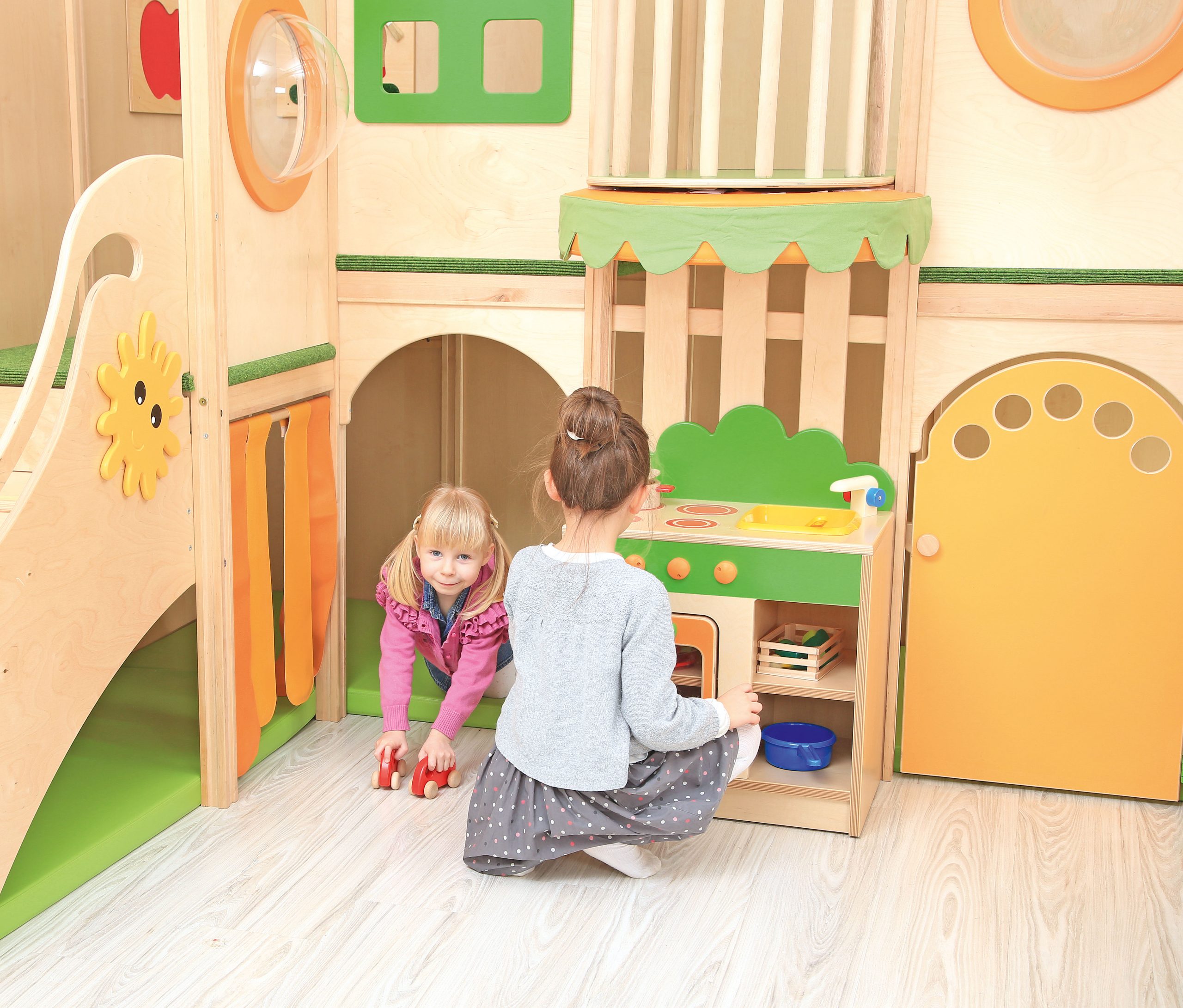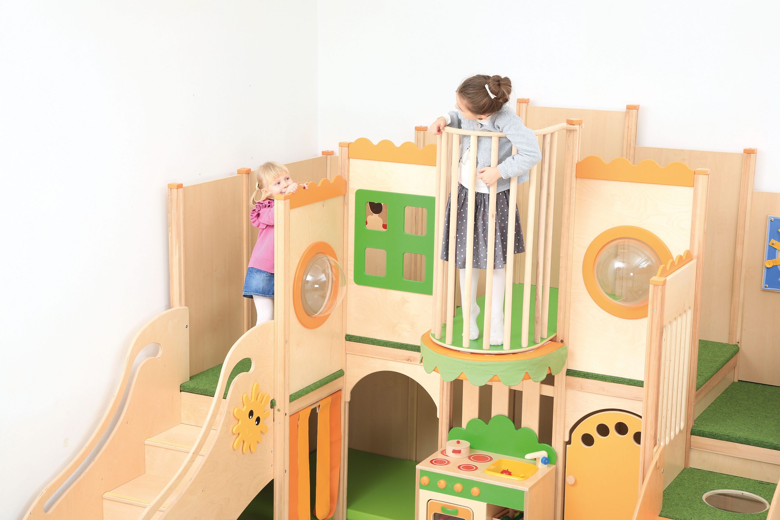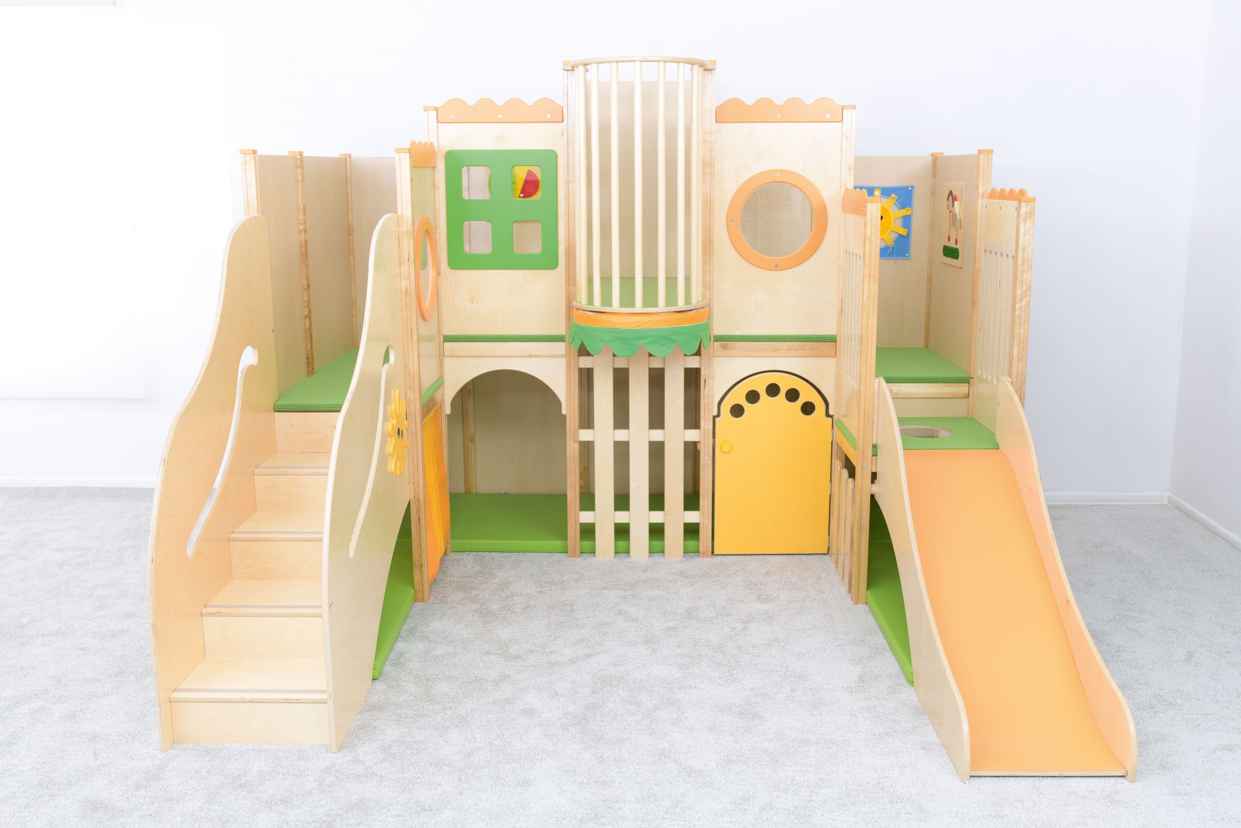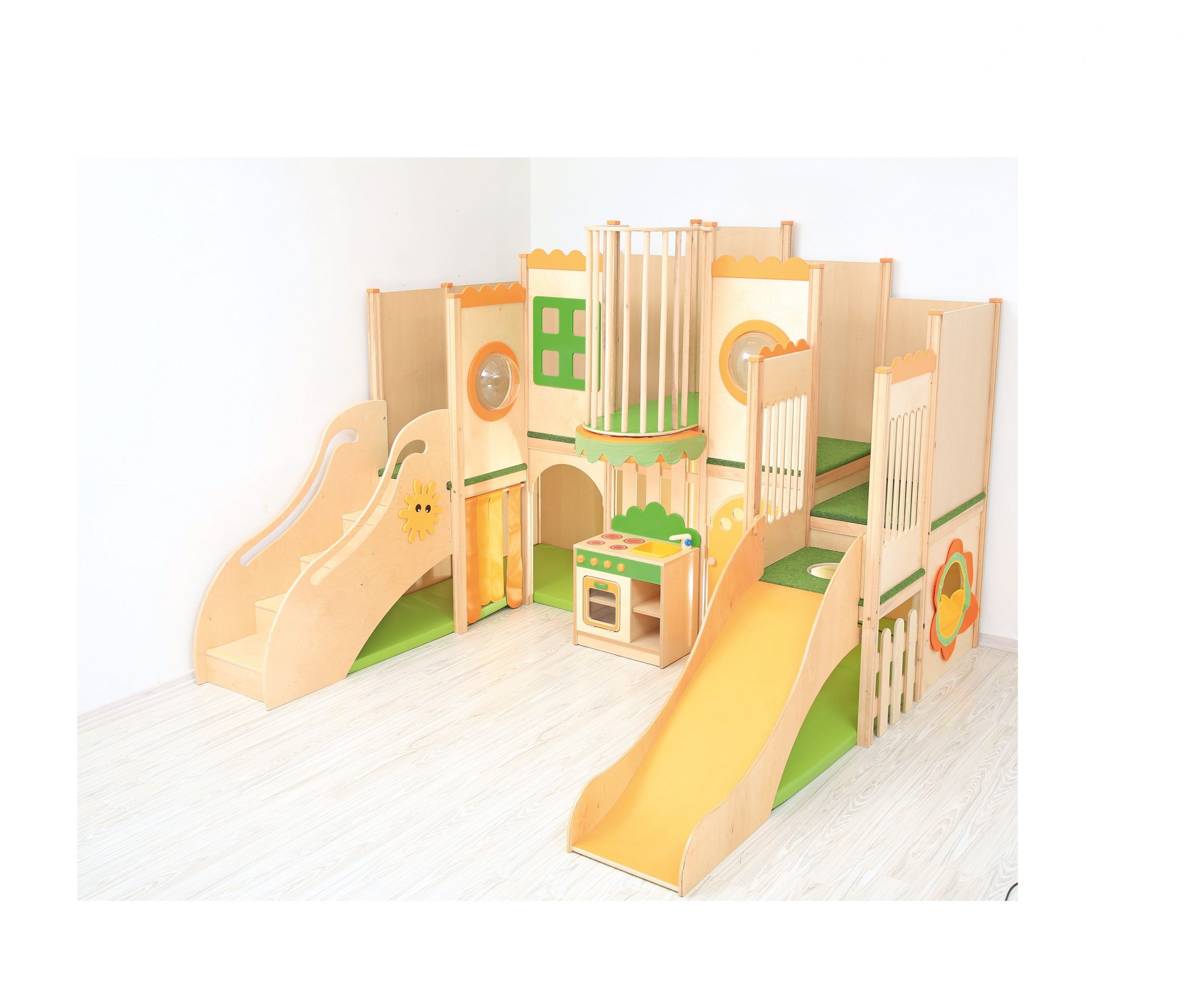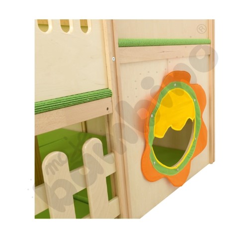 Struttura motoria realizzata in legno massello è stata dotata di molte attrazioni che interesseranno i più piccoli e forniranno grande divertimento per molti bambini contemporeanamente . Possono scivolare fuori dalla diapositiva e giocare su materassi morbidi nascosti all’interno. Struttura dotata di scivolo, scale, materassi e una finestra . Le piattaforme sono coperte di moquette. Sulle pareti sono montate piattaforme di movimentazione con sole , cavallo e pesce. La “finestra” consente di guardare al livello inferiore ..