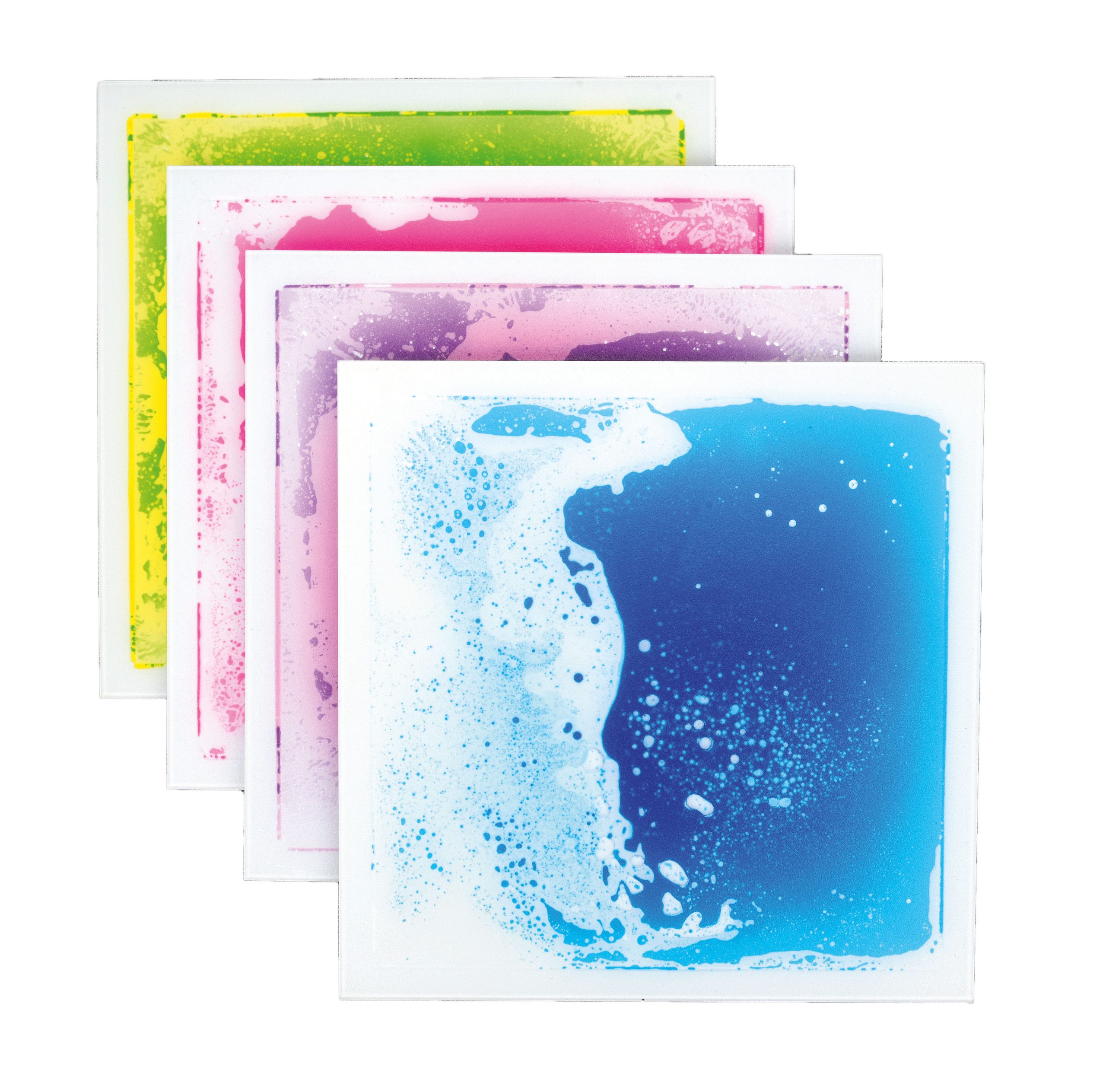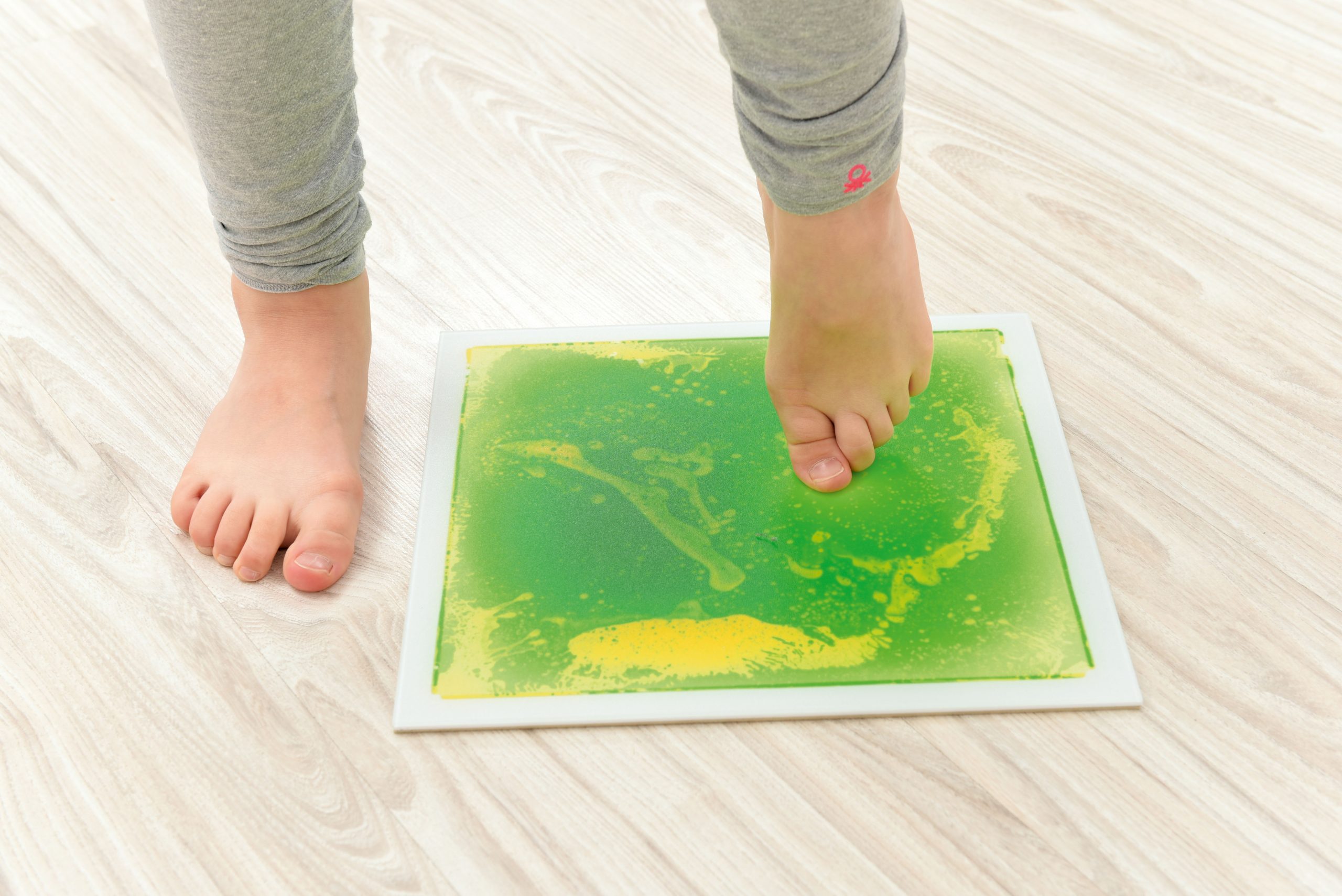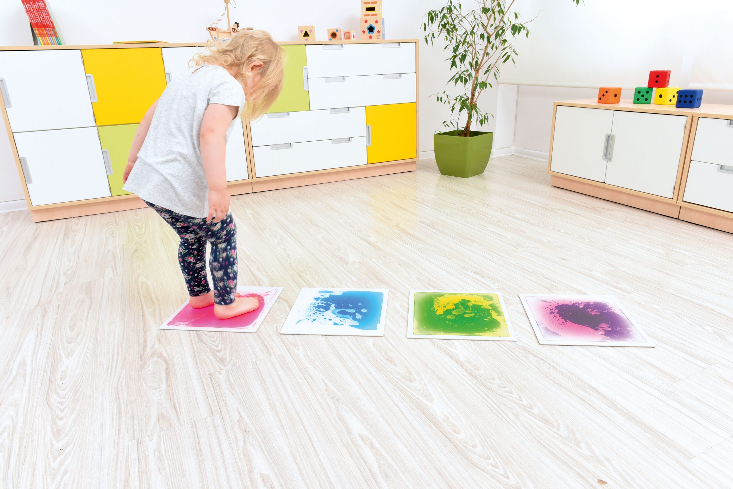 Piastrelle in resina robusta dotate di liquido colorate che si muove al calpestio, 4 colori differenti . Le piastrelle sono dotate sul fondo di gomma antiscivolo.