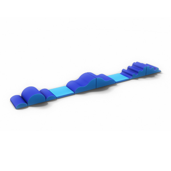 Percorso con Rivestimento GreenCover ignifugo classe 1, privo di pvc, senza ftalati, morbido, antibatterico, sfoderabile, lavabile. Interno in poliurtano espanso alta densità. Composto da 2 pedane, 2 onde, 2 dune piccole, 1 duna grande, 2 bruchi, 1 base. Altezza di ogni pezzo 30 cm.