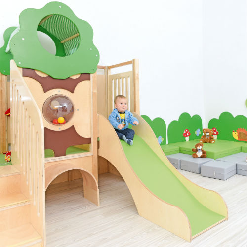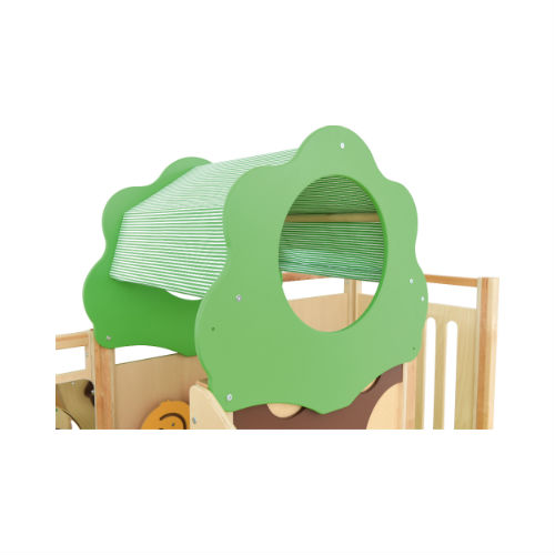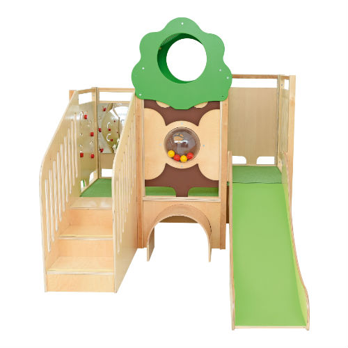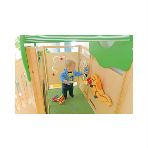 Questo angolo giochi ha molte attrazioni. Viene fornito con uno scivolo, scale, tunnel strisciante, specchio, labirinti di muro e un oblò con le palle. È realizzato in legno laminato con piastre in MDF colorato e gli oblò sono in plexiglass.