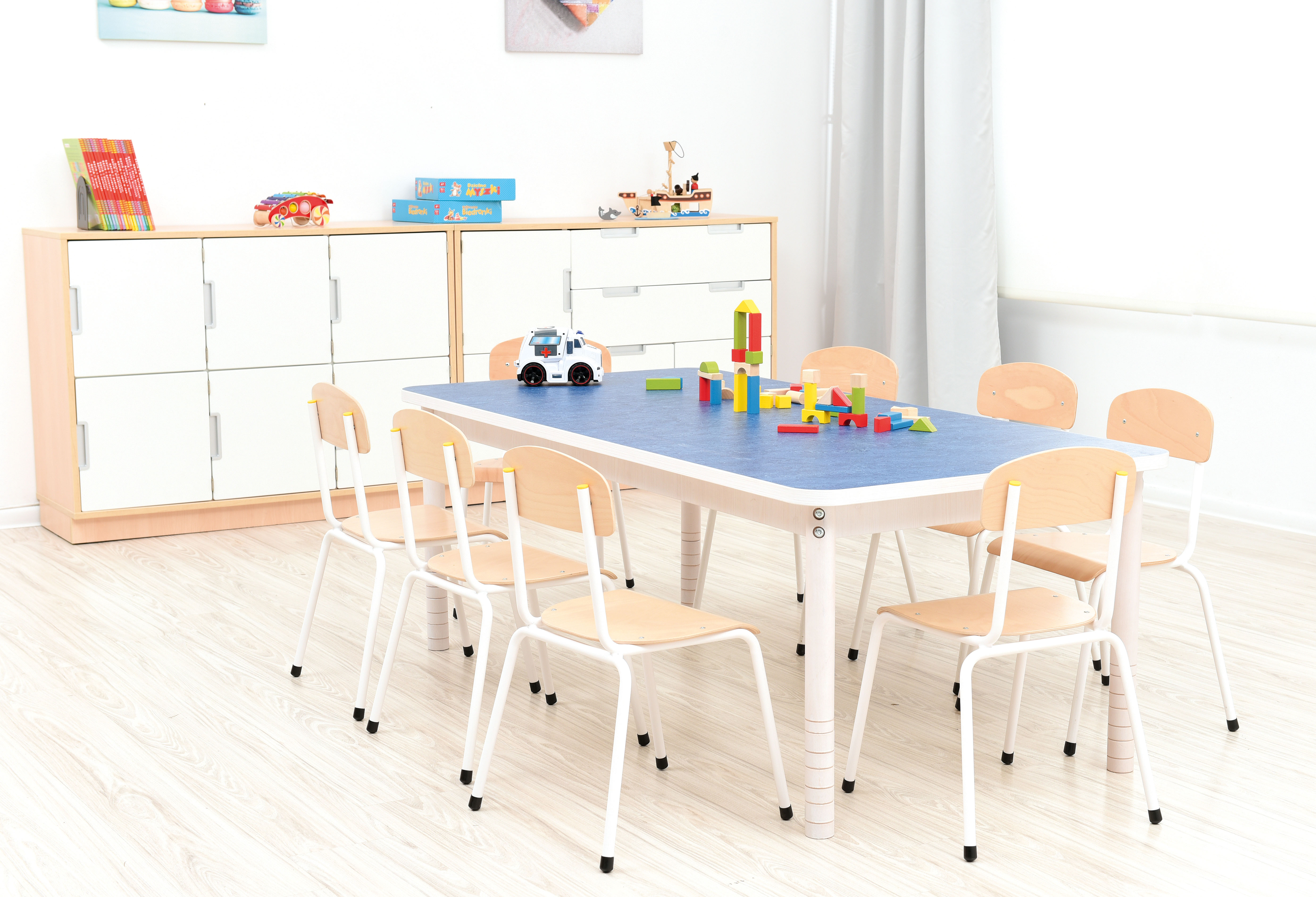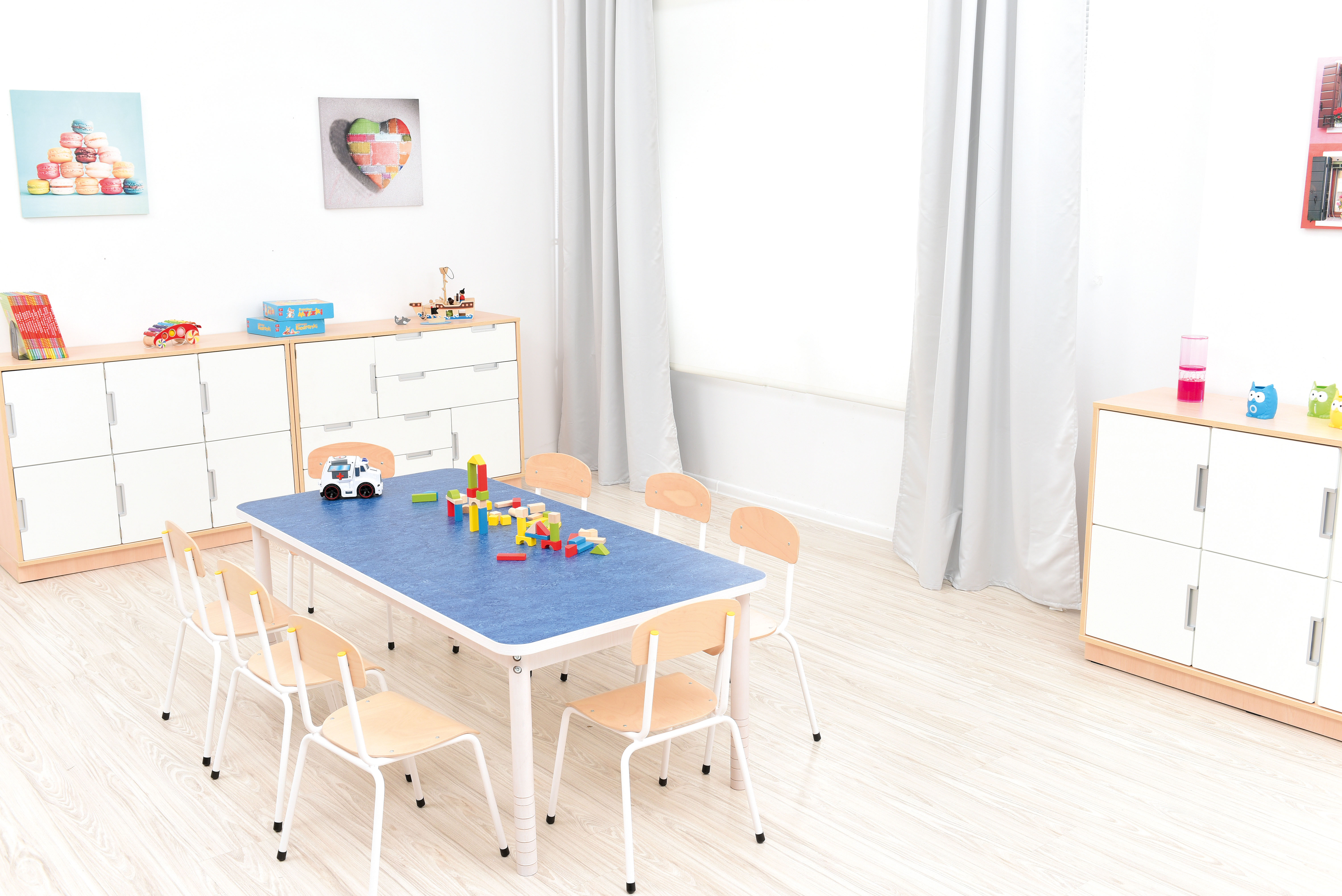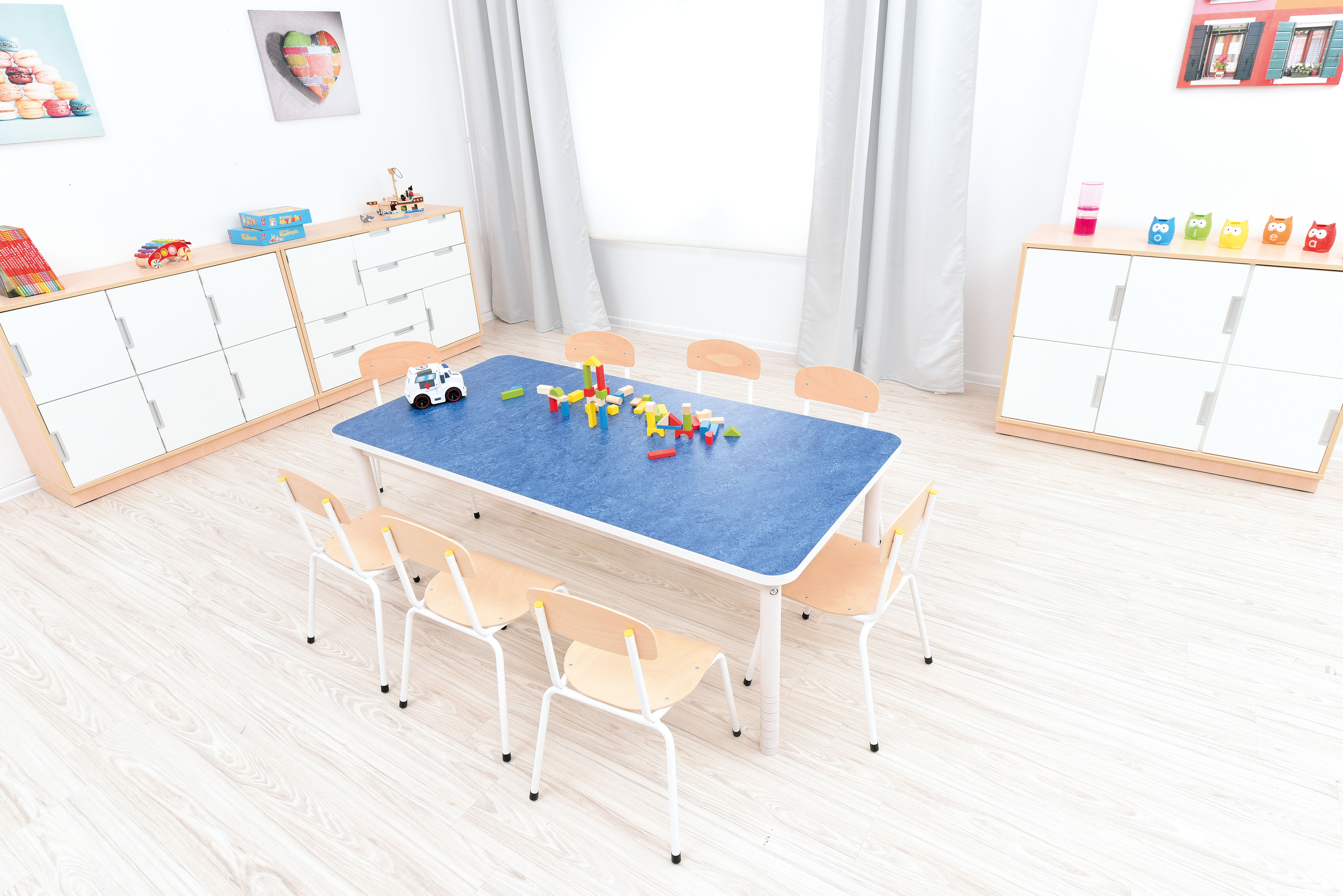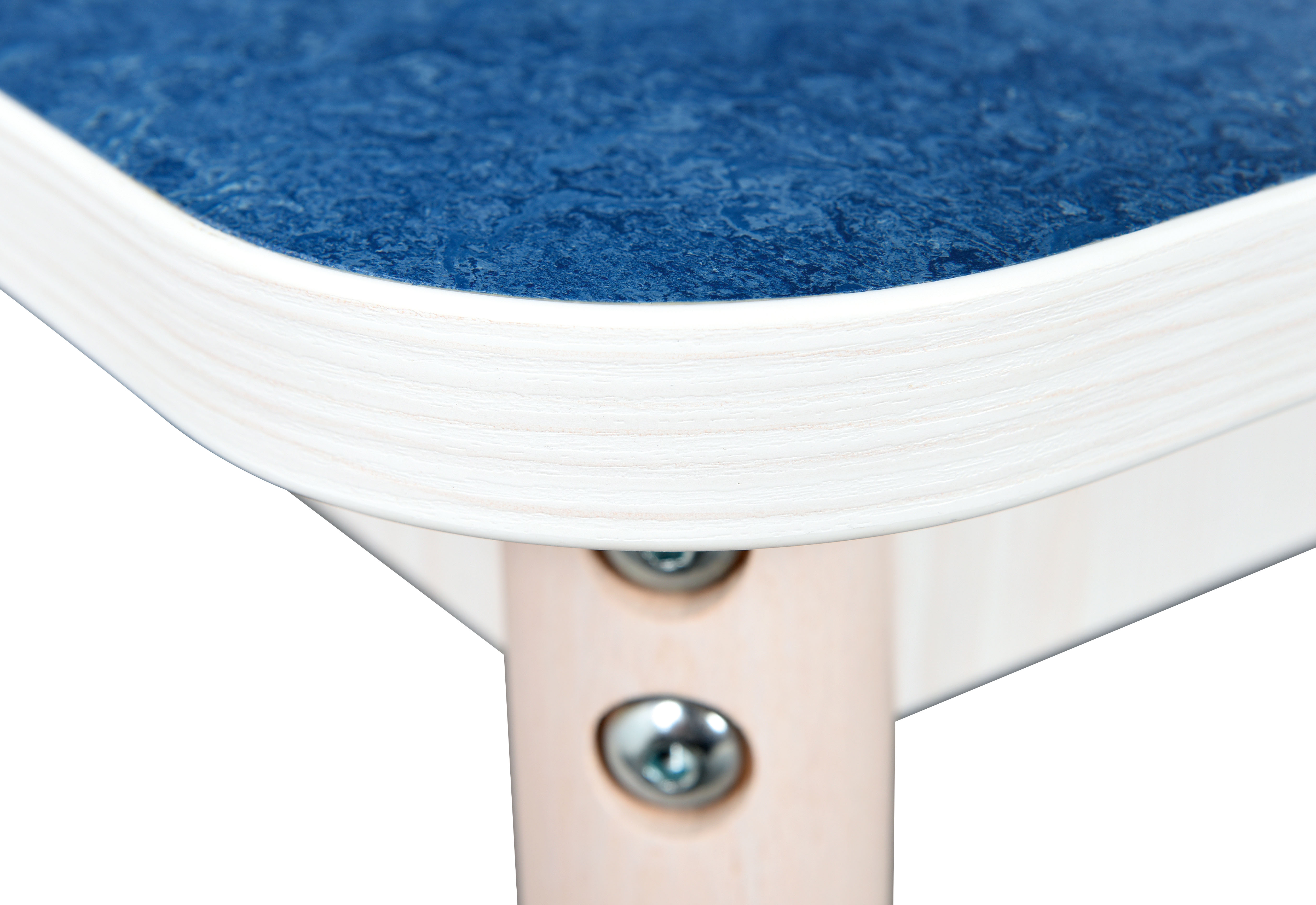 Piano tavolo rivestito in linoleum (materiale anallergico e antibatterico) che assorbe i rumori causati dalla caduta di oggetti. Piano tavolo realizzato in truciolato con strato di sughero e piastra HDF, rivestito con linoleum e strato laminato (PP) dal basso, con bordi in ABS e angoli arrotondati.