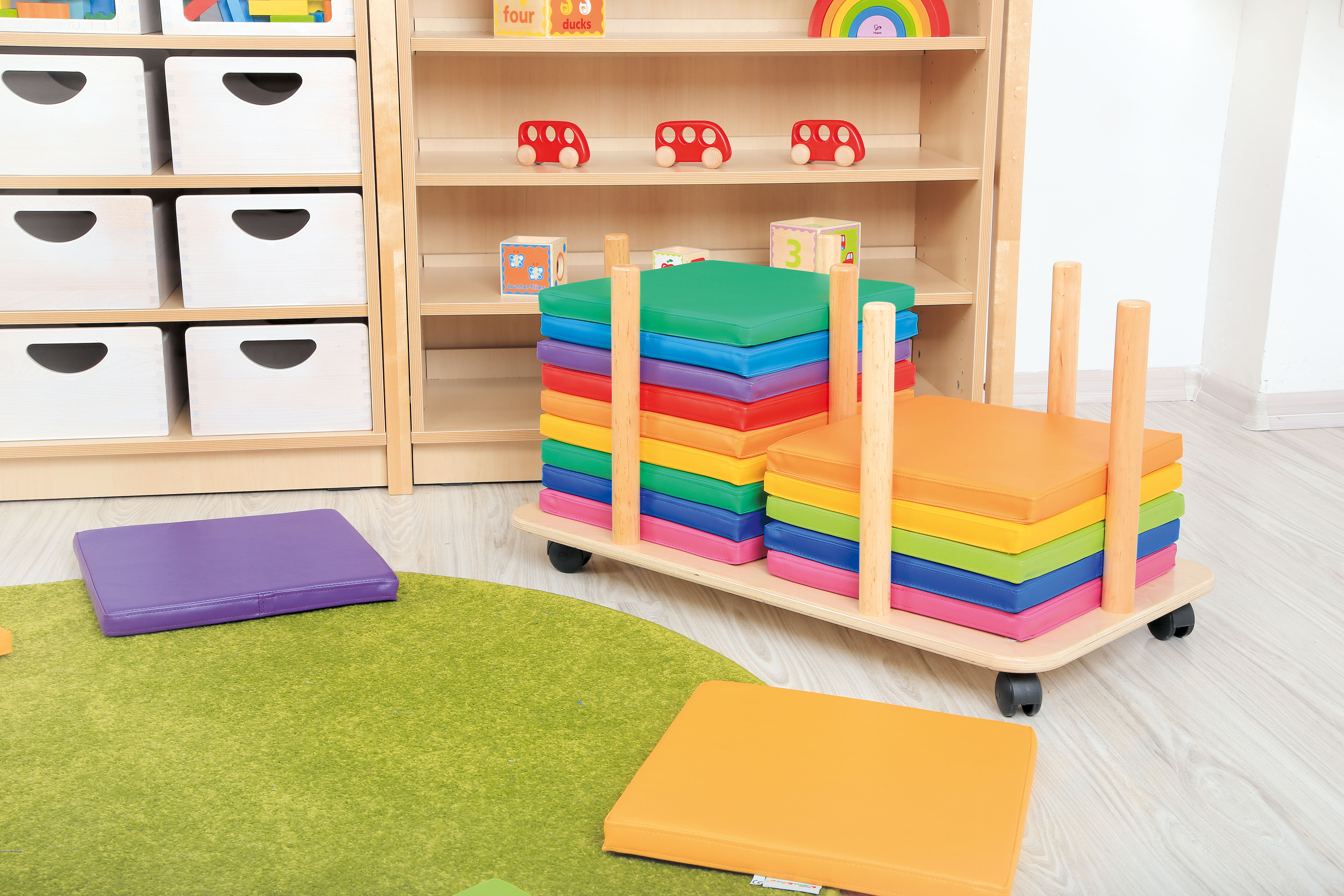 Supporto in legno su ruote per Set 20 Pouf / Cuscini Quadrati “Arcobaleno” AA1747