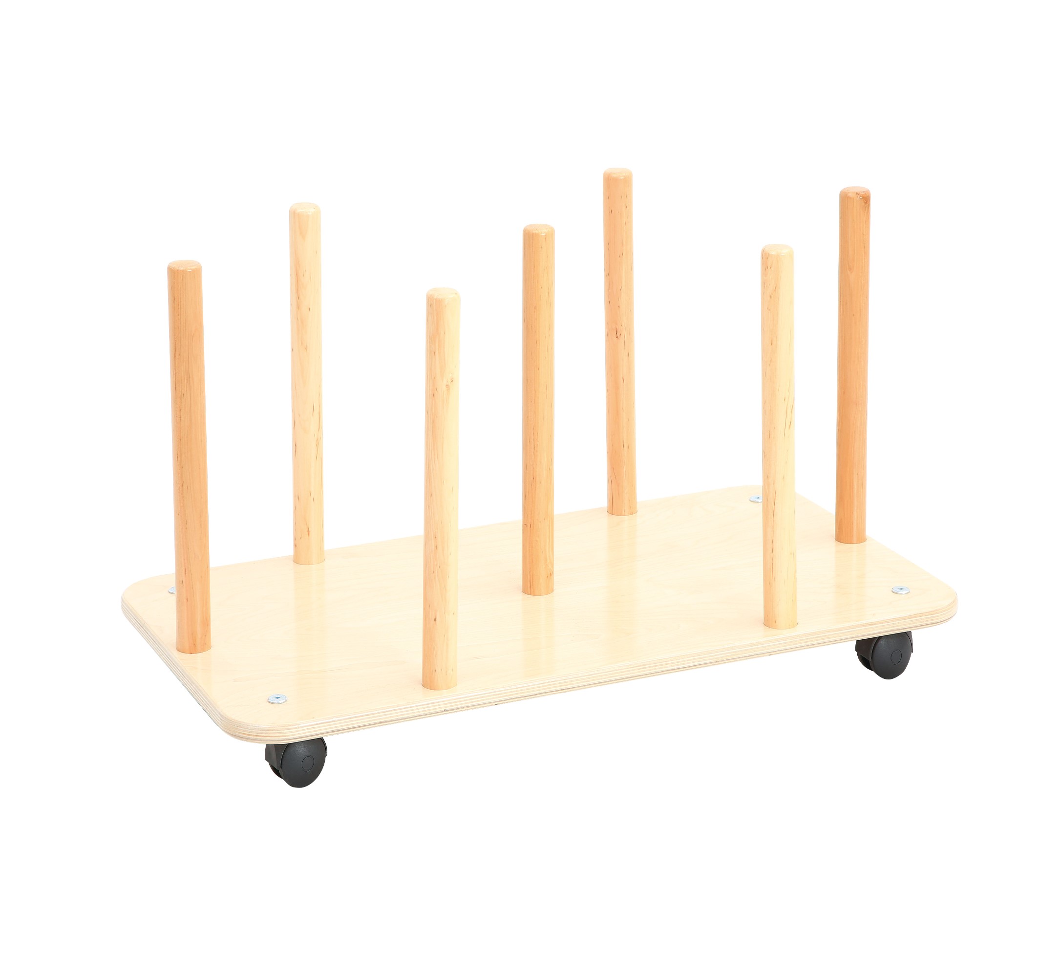 Supporto in legno massello lucidato al naturale su ruote dello spessore di 18 mm, per 20 pouff.