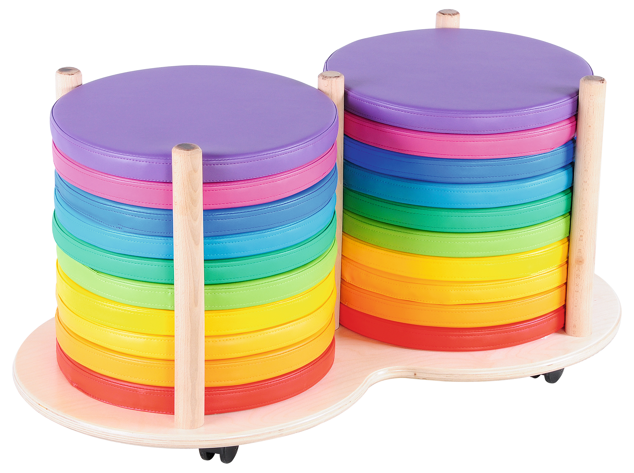 Supporto in legno su ruote per Set 20 Pouf / Cuscini rotondi “Arcobaleno” AA1315
