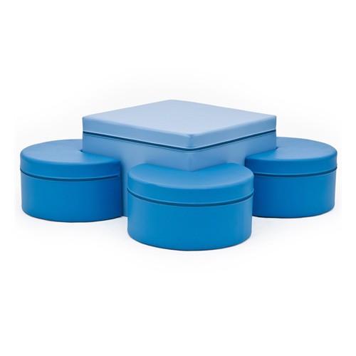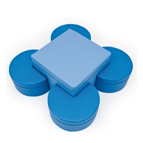 Un pouf a forma di tavolo blu mirtillo con quattro mirtilli correlati che possono essere utilizzati come sedie. Si adattano al tavolo in modo che diventino quasi come delle ruote.