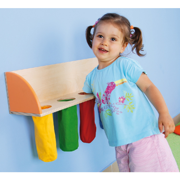 Mensolone con 5 sacchetti colorati dove nascondere oggetti o materiali da riconoscere attraverso il tatto e la manipolazione.