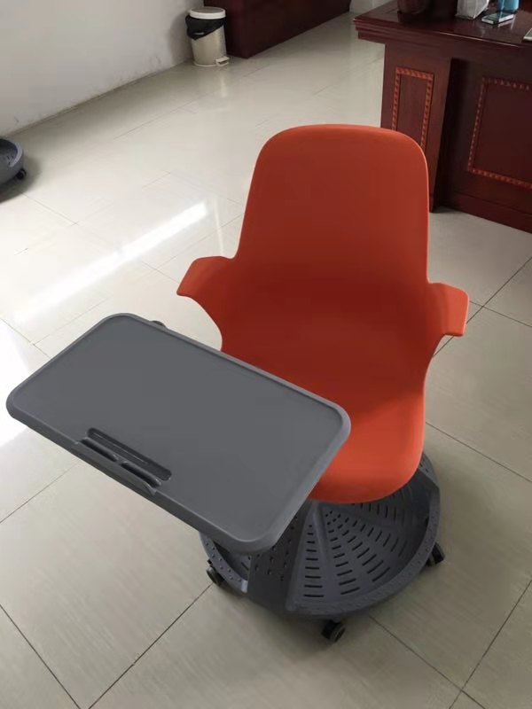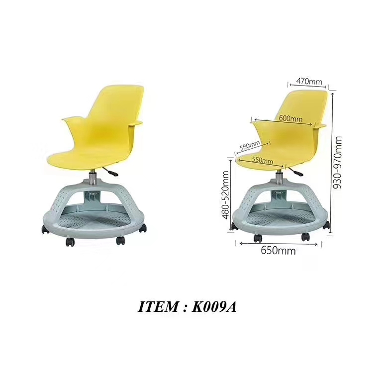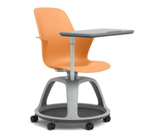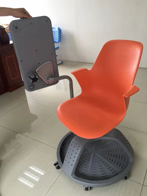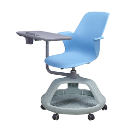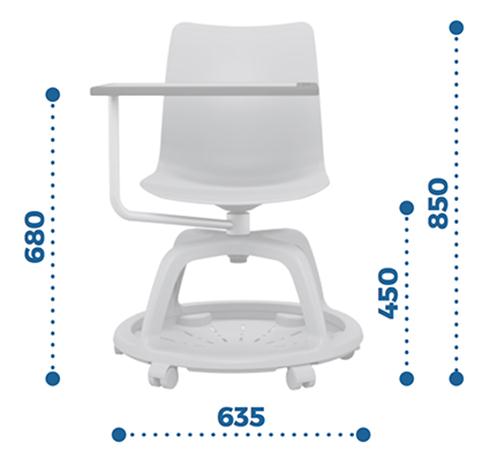 Sedia monoscocca in plastica, con base girevole a 4 razze su 6 ruote. Postazione completa di tavoletta in poliuretano con piano in laminato, compatibile con destrorsi e mancini, seduta ergonomica, tavoletta posizionata sul pignone del sedile per permettere una rotazione della tavoletta a 360 gradi. Pratico cestello porta zaino posto sul sedile e basamento microforato circolare con rotelle che consente di appoggiare oggetti dello studente.
