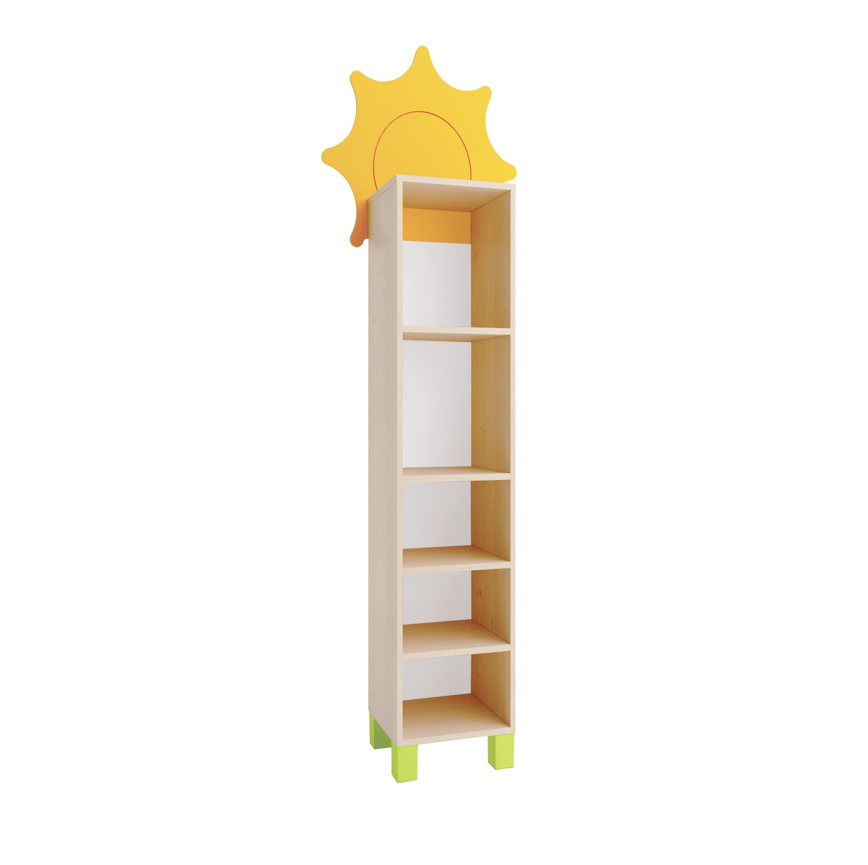 Libreria alta in conglomerato ligneo di betulla dotato di 5 vani a giorno. L’articolo è arricchito con un pannello MDF (pannello di fibra a media densità) a forma di sole; Questo dettaglio renderà la libreria unica e il vostro ambiente divertente e vivace!