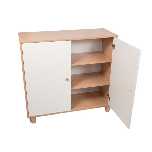 Mobile realizzato con legno nobilitato color faggio. La struttura realizzata in legno nobilitato di spessore 19 mm con bordi arrotondati a vista. Il mobile è assemblato mediante perni e barilotti in acciaio e appoggia su 5 piedini cilindrici realizzati in legno di diametro mm 60x100h con scivolanti in ABS, per una maggiore stabilità; l’anta è realizzata in nobilitato di spessore 18 mm, rivestito e laccato a polvere; le cerniere si aprono a 110° in linea con le vigenti normative in materia di sicurezza; la schiena del mobile è in nobilitato bianco di spessore 10 mm ed è a vista per consentire un posizionamento anche in centro locale come divisore. E’ possibile su richiesta montare il mobile su ruote oppure su zoccolo. Il mobile è dotato di un’anta e 2 ripiani/3 vani a giorno.