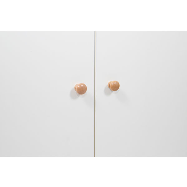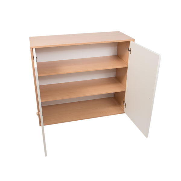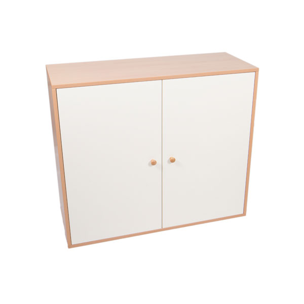 Mobile realizzato con legno nobilitato color faggio. La struttura realizzata in legno nobilitato di spessore 19 mm con bordi arrotondati a vista. Il mobile è assemblato mediante perni e barilotti in acciaio; l’anta è realizzata in nobilitato di spessore 18 mm, rivestito e laccato a polvere; le cerniere si aprono a 110° in linea con le vigenti normative in materia di sicurezza; la schiena del mobile è in nobilitato bianco di spessore 10 mm ed è a vista per consentire un posizionamento anche in centro locale come divisore.