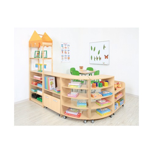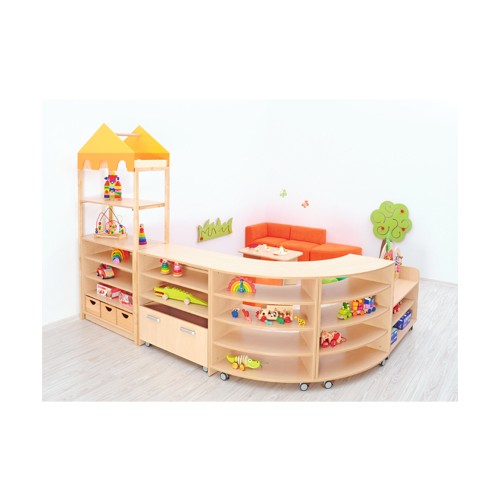 Set di mobili realizzato in bilaminato di betulla (18mm) con bordi in ABS (acrilonitrile butadiene stirene). La composizione è formata da: 2 mobiletti a semicerchio su rotelle piroettanti con vani a giorno, contenitore su rotelle, mobiletto 2 vani a giorno, mobile 2 vani e 3 cassetti, tetto colorato montato su 2 cornici in legno, pannello con labirinto e carrellino su rotelle piroettanti. Le cornici in legno sostengono anche una mensola centrale. Il prodotto ha in dotazione le guide per i cassetti! Questo prodotto donerà un tono naturale e luminoso al vostro ambiente!