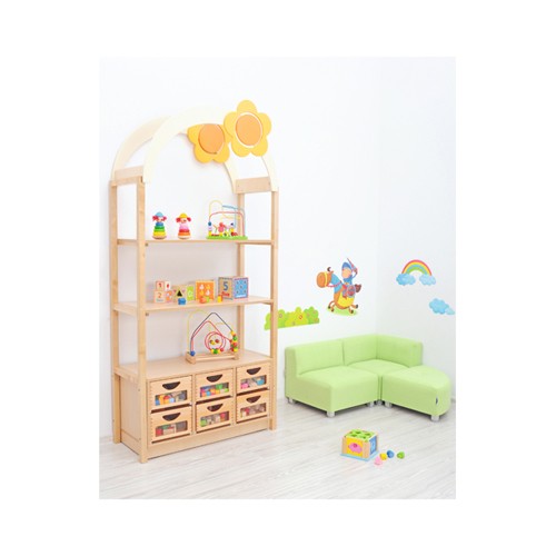 Set di mobili realizzato in bilaminato di betulla (18mm) con bordi in ABS (acrilonitrile butadiene stirene). La composizione è formata da: un mobiletto dotato di 6 cassetti, tetto con fiore montato su 2 cornici in legno. Le cornici in legno sono munite di 2 mensole. Il prodotto ha in dotazione le guide per i cassetti! Questo prodotto donerà un tono naturale e luminoso al vostro ambiente!