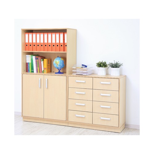 Set di mobili realizzato in bilaminato di betulla (18mm) con bordi in ABS (acrilonitrile butadiene stirene). La composizione è formata da: una cassettiera dotata di 8 cassetti e un complesso di due mobili con vani a giorno e ante incluse. Il prodotto ha in dotazione le guide per i cassetti! Questo prodotto donerà un tono naturale e luminoso al vostro ambiente!