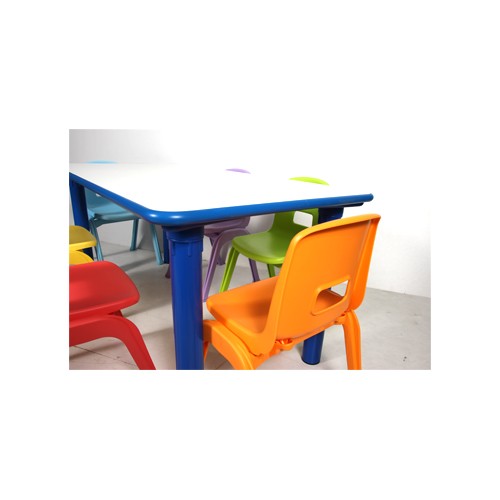 Le nostre sedie “Arcobaleno” sono realizzate in polipropilene colorato, con piedini morbidi anti-sdrucciolo. Le gambe del tavolo sono realizzate in polipropilene e avvitate al piano tramite basette in plastica, il piano è in nobilitato bianco di spessore 20mm bordato in gomma esaflex di colore blu.