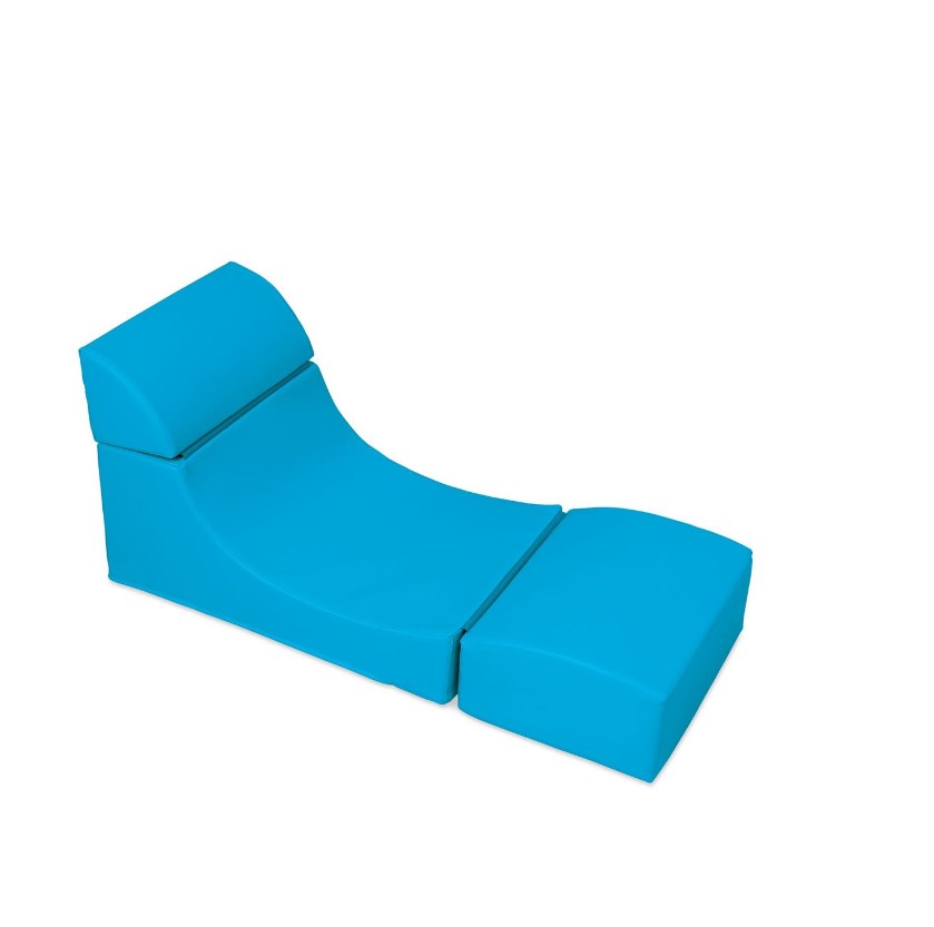 Sofa di colore azzurro e ripiegabile per essere facilmente riposto ovunque. Prodotto in tessuto pvc privo di ftalati e riempito con poliuretano espanso.