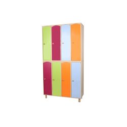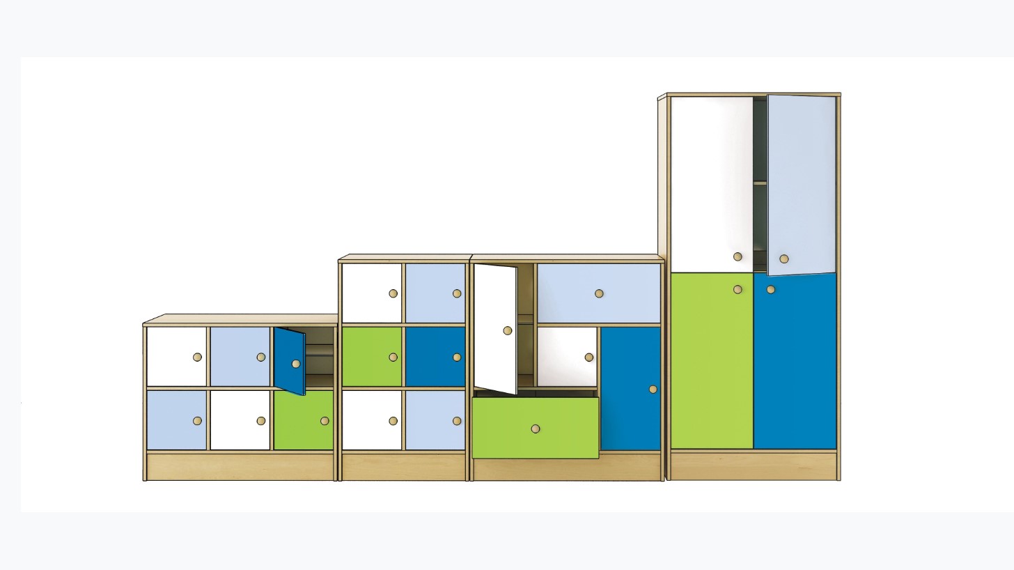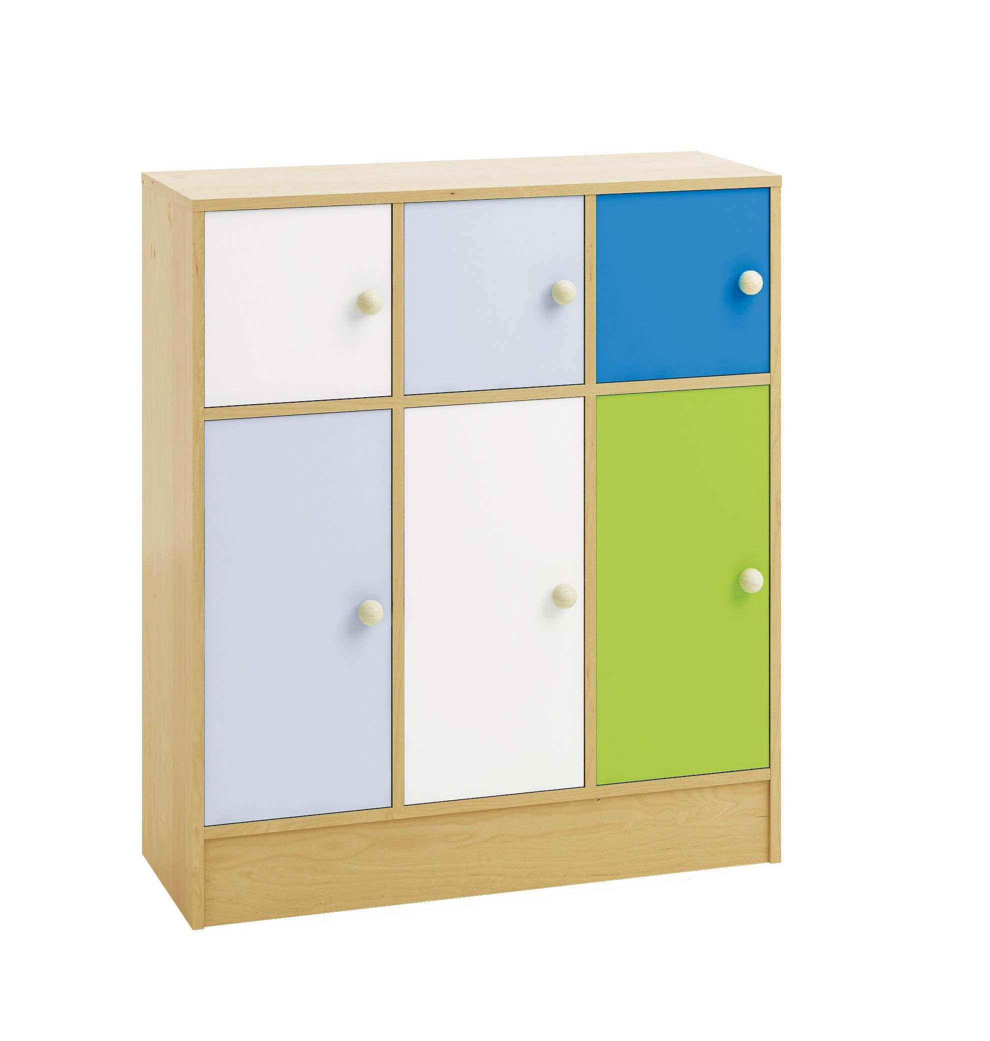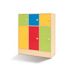 Mobile in conglomerato ligneo laminato color betulla dotato di tre ante piccole e di forma quadrata (in alto) e tre ante rettangolari (in basso) colori NEW ( blu, azzurro, verde, bianco) . Vi consigliamo questo prodotto per la sua efficacia nell’organizzare strumenti e materiali scolastici e per la sua vivacità. Le sue dimensioni rappresentano un vantaggio al fine di evitare il troppo affollamento dell’ambiente. Le ante color pastello offrono la possibilità di assegnare un casello per ogni bambino, facilmente riconoscibile.