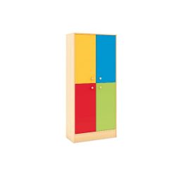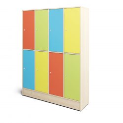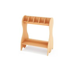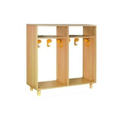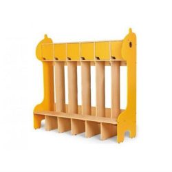 Spogliatoio a giorno con panchetta a 5 posti in legno nobilitato color faggio chiaro.