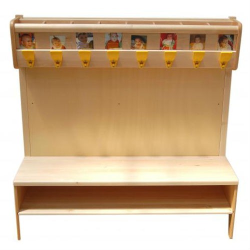 La panchetta è dotata nella parte superiore di vani portaoggetti e appendiabiti. Nella parte inferiore è possibile riporre le scarpe del cambio. Sono presenti inoltre 8 portafotografie in plexiglass dove riporre una foto (o disegno) identificativo di ciascun bimbo in modo da agevolare il riconoscimento del posto assegnato.