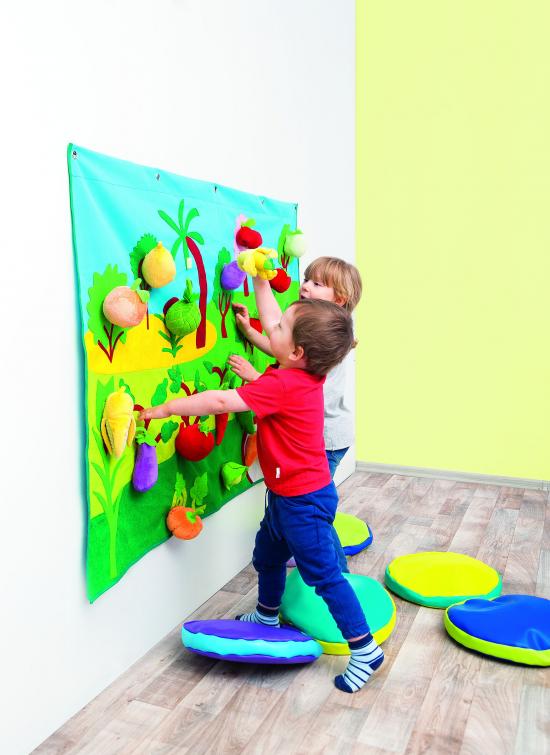 Un colorato ed allegro tappeto con alberi e piante disegnati. Grazie alle applicazioni in velcro è possibile attaccare i frutti e gli ortaggi a ciascuna pianta di origine.