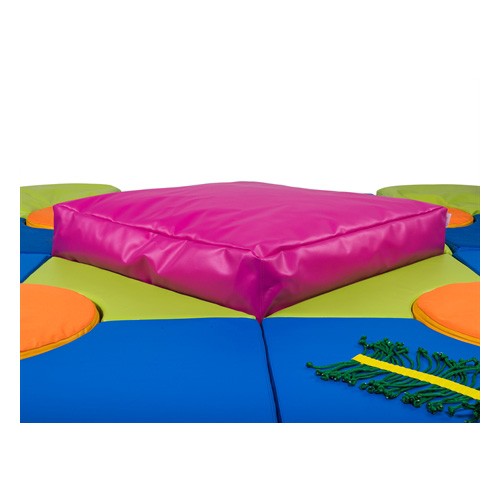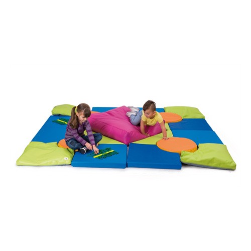 Composto da quadrotti blu, verdi, un grande cuscino rosa e 4 rotondi arancioni.