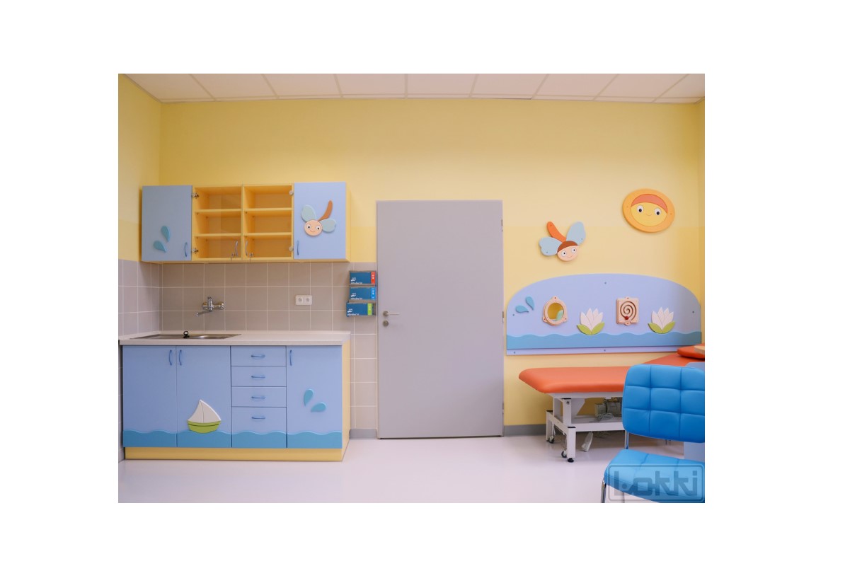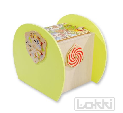 La base del tavolo sono tre giocattoli didattici – gioco magnetico, ruota rotante e specchio indistruttibile. Sulla parte superiore è posto un gioco magnetico che sviluppa capacità motorie fine, pazienza e concentrazione. Sul lato anteriore c’è una ruota rotante. I bambini cercano di trovare le metà corrispondenti. Questa attività permette ai bambini di abbinare insolitamente combinazione per creare creature fantastiche. Sul retro c’è uno specchio di metallo lucido. Sui lati rimanenti possono essere collocati giocattoli che sviluppano abilità motorie fine – un timone e una spirale.