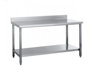 Tavolo con alzatina posteriore e ripiano di fondo struttura portante realizzata interamente in acciaio INOX AISI 304. Piedini di livellamento . Piano di lavoro in acciaio INOX AISI 304, spessore 1mm, rinforzato con truciolare bilaminato con trattamento idrofugo ed ignifugo, spessore 20mm. Bordo del piano di 40mm; eventuale alzatina posteriore 100x15mm chiusa posteriormente da copertura in acciaio INOX AISI 304. Ripiano di fondo rinforzato da profilo in acciaio INOX AISI 304 spessore 1mm. Ripiano intermedio regolabile in altezza rinforzato da profilo in acciaio INOX AISI 304, spessore 1mm. Porte complete di controporte e di pannello coibente.