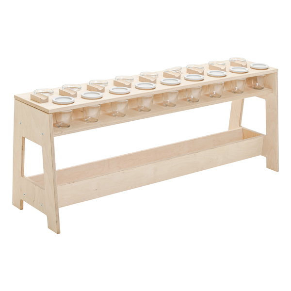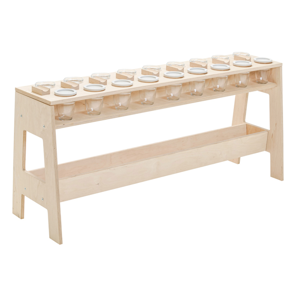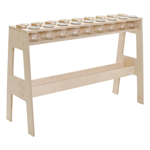 Il tavolo da pittura di gruppo dal design pratico offre spazio per impilare le ciotole per i colori e le tazze impilabili per l’acqua con mensole per tre spazzole ciascuna (due piccole, una grande). Sotto la superficie del tavolo è presente un vano portaoggetti per altri utensili.