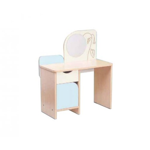 Una toeletta dai colori pastello, dotata di anta e specchio decorato con una elegante incisione floreale.